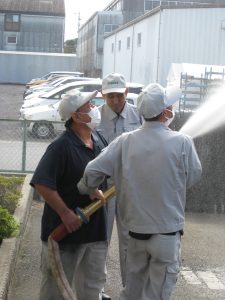 例年同様、屋外消火栓の使用方法や消火器の取り扱いについて説明を受けた後、実際に放水訓練・消火訓練を行いました。